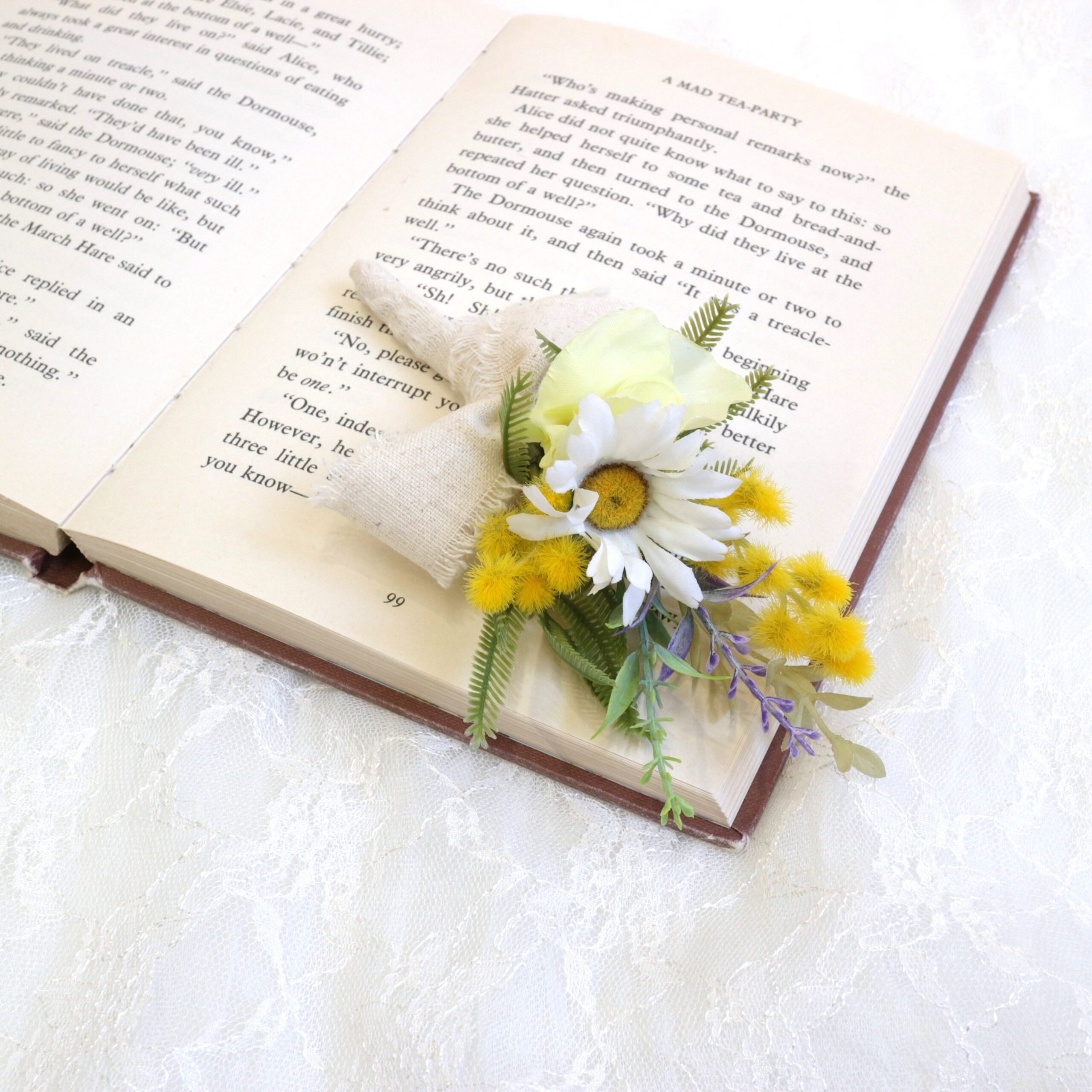 野原から摘んできてそのまま束ねたようなナチュラルテイストに仕上げました。手元を華やかに彩るブーケには、お揃いのブートニアもセットでご用意しております。